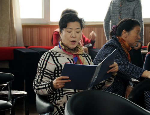 课间休息时,一位女同志仍手持歌谱认真练习